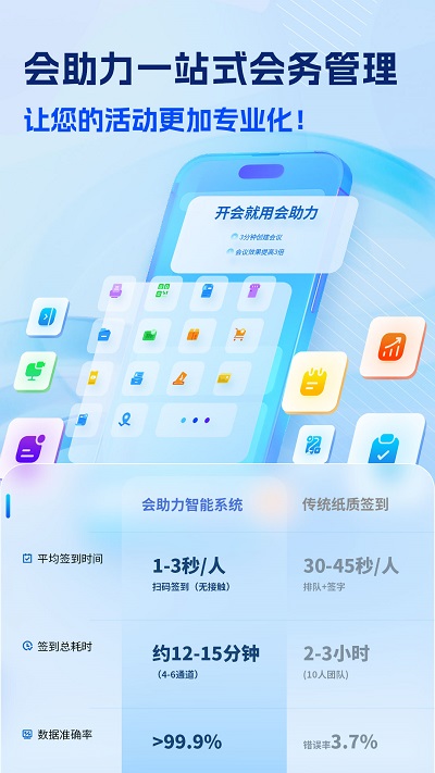 在竞争激烈的商业环境中,一场高效、智能的会议不仅是信息传递的载体,更是企业创新力与执行力的体现。会助力会务系统以科技为杠杆,助您撬动会议管理的无限可能——节省时间、提升体验、创造价值。