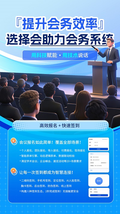在数字化浪潮中,活动管理已从“经验驱动”转向“科技驱动”。会助力会务系统以创新技术为基石,以用户需求为核心,致力于为每一场活动提供科学、系统、有序的解决方案。无论是提升效率、优化体验,还是挖掘价值、驱动增长,我们都能成为您最可靠的伙伴。